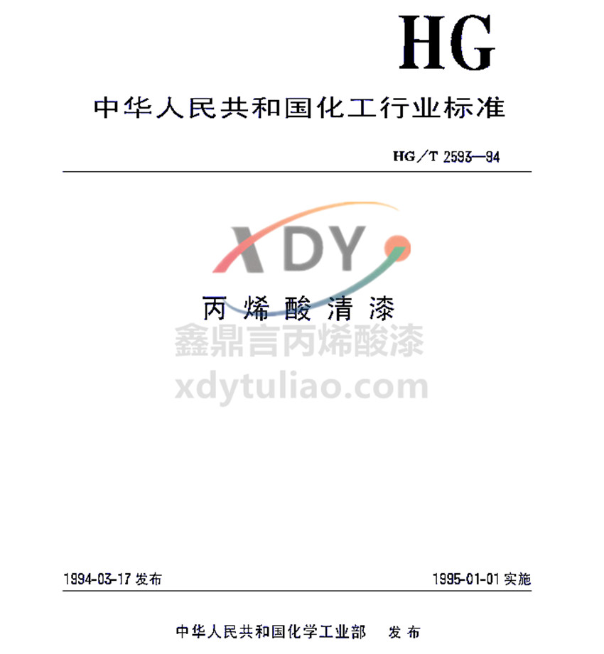 式中:K—酸價,mg KOH/g; N—氫氧化鉀-乙醇溶液濃度,mol/L; V—滴定氫氧化鉀-乙醇溶液的體積,mL; G—試樣重量,g。 兩次平行試驗結果之差與平均值之比不得大于3%。 5.6、干燥時間 5.6.1、表干 按GB/T6753.2的規(guī)定進行。 5.6.2、實干 按GB/T1728中甲法的規(guī)定進行。 5.7、漆膜顏色及外觀 按GB/T9761的規(guī)定進行。 5.8、硬度 按GB/T1730中科尼格擺的規(guī)定進行。 5.9、漆膜彎曲 試板為馬口鐵板(50mm×120mm×0.2-0.3mm)3塊,按4.4制備樣板。在GB9278規(guī)定的條件下干燥24h后,按GB/T6742的規(guī)定進行。 5.10、劃格試驗 試板為馬口鐵板(50mm×120mm×0.2-0.3mm)3塊,按4.4制備樣板。按GB/T9286的規(guī)定進行,切割數(shù)為6,切割間隔1mm。 5.11、耐汽油性 試板為LY12鋁板(50mm×120mm×1-2mm)4塊,3塊投入試驗,1塊作標準板。 按GB/T1727中的噴涂法制備漆膜,在GB9728規(guī)定的環(huán)境條件下干燥24h后,將樣板的2/3浸入到GB1787RH-75號航空汽油中,按規(guī)定時間取出,10min后,按GB/T9274中5.4的規(guī)定檢查漆膜。 5.12、耐水性 試板為LY12鋁板(50mm×120mm×1-2mm)4塊,3塊投入試驗,1塊作標準板。 按GB/T1727中的噴涂法制備漆膜,在GB9278規(guī)定的環(huán)境條件下干燥24h后,用1:1的石蠟和松香混合物包封樣板的背面與周邊,待其冷卻后,浸入GB/T6682的三級水中。按規(guī)定時間取出,按GB/T9274中5.4的規(guī)定檢查漆膜。 5.13、耐熱性 試板為LY12鋁板(50mm×120mm×1-2mm)4塊,按4.4制備樣板,3塊投入試驗,1塊作標準板。 按GB/T1735的規(guī)定進行。 6、檢驗規(guī)則 6.1、本標準中所列的全部技術指標項目均為型式檢驗項目,其中除耐熱性一年抽檢一次外,其余均為出廠檢驗項目,每批必檢。 6.2、產品由生產廠的檢驗部門按本標準規(guī)定進行檢驗,生產廠應保證所有出廠產品均符合本標準的技術指標,產品應有合格證,必要時另付使用說明及注意事項。 6.3、接收部門有權按本標準的規(guī)定對產品進行檢驗,如發(fā)現(xiàn)產品質量不符合本標準技術指標規(guī)定時,供需雙方共同按GB3186重新取樣進行復驗,仍不符合本標準技術指標規(guī)定時,產品即為不合格,接收部門有權退貨。 6.4、產品按GB3186進行取樣,樣品應分兩份,一份密封貯存?zhèn)洳椋硪环葑鳈z驗樣樣品。 6.5、供需雙方應對產品包裝及數(shù)量進行檢查核對,如發(fā)現(xiàn)有損漏,數(shù)量由出入等現(xiàn)象時,應及時通知有關部門。 6.6、供需雙方在產品質量上發(fā)生爭議時,由產品質量監(jiān)督檢驗機構進行仲裁檢驗。 7、標志、包裝、運輸和貯存 7.1、標志 按GB/T9750的規(guī)定進行。 7.2、包裝 產品應裝于清潔、干燥、密封、內無機械雜質的容器中。 7.3、運輸 產品在運輸時應防止雨淋、日光曝曬、避免碰撞并應符合交通運輸部門的有關規(guī)定。 7.4、貯存 產品應存放在陰涼通風、干燥、防止日光直接照射并隔絕火源,遠離熱源的庫房內。夏季氣溫過高時,應設法降溫。 7.5、產品在符合7.2和7.3的規(guī)定條件下,自生產完成日算起,有效貯存期為一年,超過貯存期可按本標準規(guī)定的項目進行檢驗,如果符合技術要求,仍可使用。 丙烯酸清漆簡介: