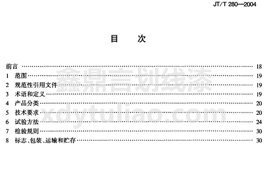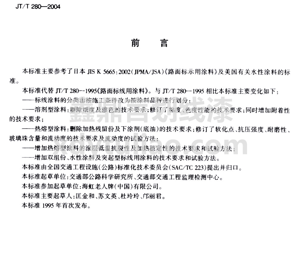 JT/T 280-2004路面標線涂料標準是小編照搬JT/T 280-2004《路面標線涂料》紙質版內容,大家可以放心參考。更多防腐涂料執行國家和行業標準等防腐涂料相關信息可以參與網站:www.hp628.cn